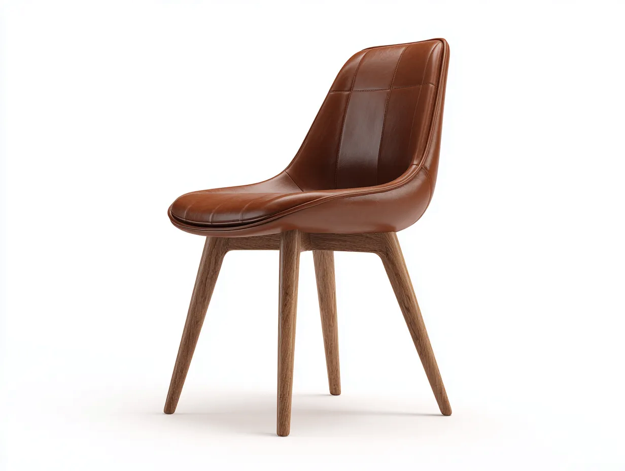 La seduta è rivestita in pelle sintetica di colore marrone, con cuciture visibili che valorizzano la superficie. La struttura portante e le gambe sono realizzate in legno, lavorato per assicurare stabilità e una finitura naturale uniforme.